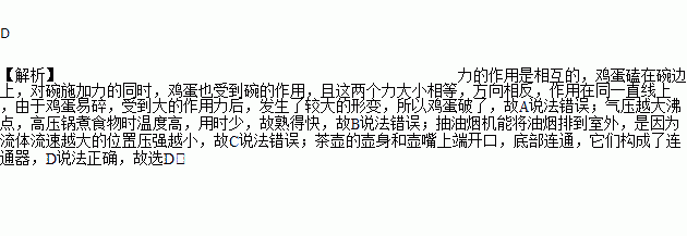 A. 鸡蛋磕在碗边上碎了,说明物体间相互作用力的大小不相等