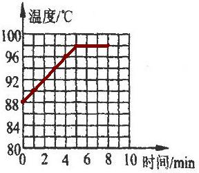 小明在“观察水的沸腾”实验中,当水温升到88℃时,每隔1min读一次温度计的示数.直到水沸腾3min后停止读数,数据记录如下表;| 时间/min | l | 2 | 3 | 4 | 5 | 6 | 7 | 8 | |