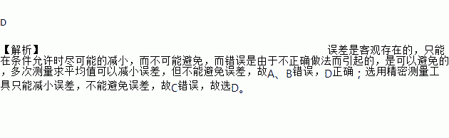 D 【解析】误差是客观存在的,只能在条件允许时尽可能的减小,而不可能避免,而错误是由于不正确做法而引起的,是可以避免的,多次测量求平均值可以减小误差,但不能避免误差,故A、B错误,D正确;选用精密测量工具只能减小误差,不能避免误差,故C错误,故选D。