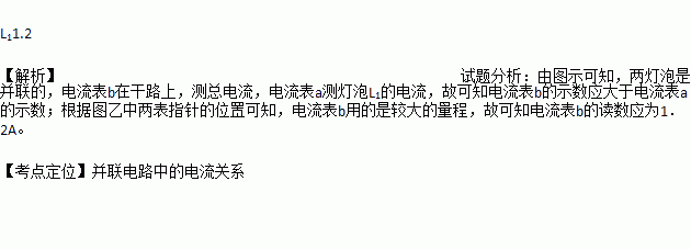 如图甲所示电路,当开关S闭合后,电流表的指针偏转如图乙所示,其中a电流表测量的是通过 (选填“电源”、“L1”或“L2”)的电流,b电流表的读数应为 A.