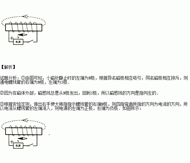 (3)如图丙所示,闭合开关,小磁针静止在通电螺线管正下方.在图中虚线上用箭头标出磁 感线方向并标出电源的正极.