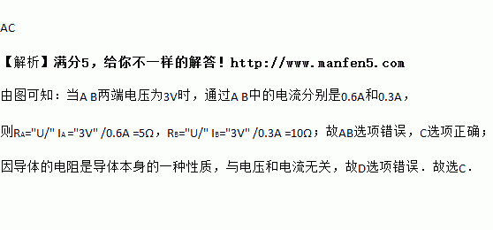 在某一温度下,连接在电路中的两段导体A和B中的电流与其两端电压的关系如图所示,由图中信息可知