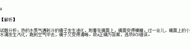 冬季,在家里洗澡时会发现浴室墙壁上的镜子很快模糊起来,洗澡结束一段时间后,镜子又变得清晰。这个过程发生的物态变化是