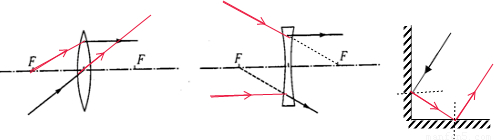 (2)平行于主光轴的光线经凹透镜折射后折射光线反向延长通过焦点,指向另一侧焦点的光线经凹透镜折射后折射光线平行于主光轴.如下图所示: