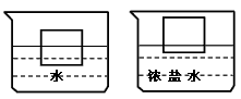 有两个完全相同的正方体木块,分别漂浮在水和浓盐水中,液面位置如图所示。请根据木块在水中的情形,画出另一木块在浓盐水中静止时的大致位置图。