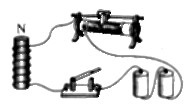 请你用笔画线代替导线将图所示的电路连接完整,并标出通电螺线管的N极.要求: 闭合开关后,向左移动滑动变阻器的滑片,通电螺线管的磁性增强.