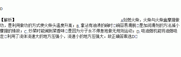 D. 吸油烟机能将油烟吸走,是因为空气流速越快,压强越小