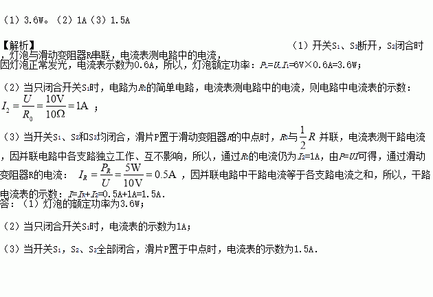 (3)当开关S1,S2、S3全部闭合,滑片P置于中点时,电流表的示数。