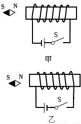 实验过程:如图甲,闭合开关,电流从螺线管右端流入、左端流出,通电螺线管有磁性,使小磁针的N极指向通电螺线管的左端;