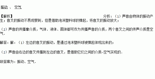 如下图,敲击右侧的音叉,左边完全相同的音叉也会发声,并且把泡沫塑料球弹起,说明左边的音叉也在___________,两个音叉之间的传声介质是____________。