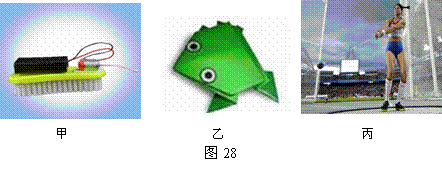 车子一般都是依靠车轮的转动而前进的,什么样的车不需要轮子也可以前进呢?如图28甲所示,选一个刷毛弹性较好的毛刷,然后将带开关的电池盒与小电动机相连并用双面胶固定在刷子上,将棉签一端剪掉,安插在电动机的轴上,在适当位置将棉签折弯。打开电动机的开关,折弯的棉签旋转起来后,刷子小车就会运动起来了。刷子小车的设计灵感来源于折纸青蛙,如图28乙所示,当手按动青蛙的后部时,青蛙给桌面一个力,同时桌面也给青蛙一个力,在相互作用力和青蛙自身的作用下,青蛙就可以向前跳动了。刷子是靠电动机上的棉签做圆周运动从而上下振动,使刷子的刷毛不断发生弯曲伸直,与桌面发生相互作用,这样刷子就像长了腿一样走起来了。