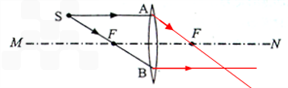 (4分)如图所示,SA、SB是光源S发出的两条光线。其中SA平行于主光轴,SB过左焦点,利用这两条光线通过凸透镜的折射光线找到像S’的位置(注意标出箭头方向)。