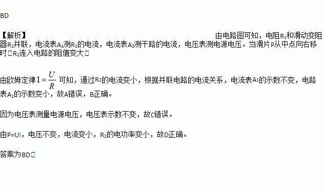 如图所示的电路中,电源电压不变,R1为定值电阻。闭合开关S,当滑片P从中点向右移时