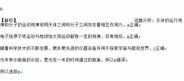 D 【解析】试题分析:天体的运行规律和分子的运动规律说明天体之间和分子之间存在着相互作用力,A正确; 电子绕原子核运动与地球绕太阳运动都有一定的规律,非常相似,B正确; 随着科学技术的不断发展,更多更先进的仪器设备将用于探索宇宙与微观世界,C正确; 光年表示距离的长短,是光在一年的时间通过的距离,所以D错误; 所以选择D。