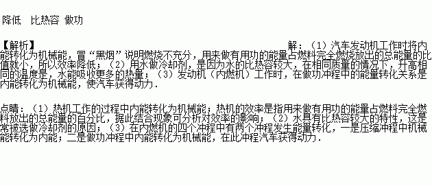 当汽油在发动机内燃烧不充分时会冒“黑烟”,这时发动机的效率_____(选填“升高”、“不变”或“降低”).发动机散热器常用水做冷却剂,这是因为水的_____大.发动机(内燃机)工作时,_____冲程使汽车获得动力.
