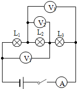 解答:解:由电路图可知,三灯泡串联,电流表测电路中的电流,电压表V1测L1和L2两端的电压,电压表V2测L2两端的电压,电压表V3测L2和L3两端的电压,如下图所示: