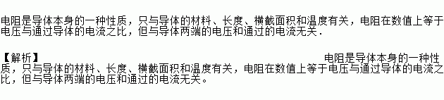 电阻是导体本身的一种性质,只与导体的材料、长度、横截面积和温度有关,电阻在数值上等于电压与通过导体的电流之比,但与导体两端的电压和通过的电流无关. 【解析】电阻是导体本身的一种性质,只与导体的材料、长度、横截面积和温度有关,电阻在数值上等于电压与通过导体的电流之比,但与导体两端的电压和通过的电流无关。