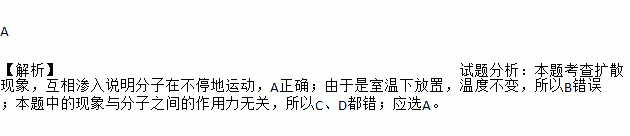 A 【解析】试题分析:本题考查扩散现象,互相渗入说明分子在不停地运动,A正确;由于是室温下放置,温度不变,所以B错误;本题中的现象与分子之间的作用力无关,所以C、D都错;应选A。