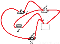 解答:解:S1在干路上,S2和灯泡串联在一条支路上,灯泡与电动机并联,如下图所示: