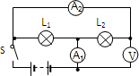 这样,两灯并联,电流表A1测干路中电流,A2测L2电流,电压表测电源电压.