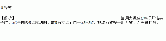 如图是同学们常用的燕尾夹,AB=BC,当用力摁住C点打开该夹子时,可把________点看作支点,此时夹子可近似看作________(选填“省力”“费力”或“等臂”)杠杆。