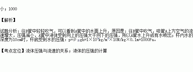 如图所示,把饮料吸管A插入盛水的杯中,另一根吸管B的管口贴靠在A管的上端.往B管中吹气,可以看到A管中的水面上升.这是因为A管上端口附近空气压强变 (填“大”或“小”)的缘故;当杯内水的深度为10cm时,杯底受到水的压强大小为 Pa.(g取10N/kg)
