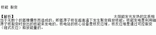 核能 裂变 【解析】太阳能发光发热的实质相当于无数个的氢弹爆炸而造成的,即氢原子核在超高温下发生聚变释放核能;核能发电是利用铀原子核裂变时放出的核能来发电的,核电站的核心设备是核反应堆,核反应堆是通过可控裂变(链式反应)释放能量的。