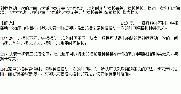 ijУ°ËÄê¼¶1¡¢2Á½°àµÄ¿ÎÍâ̽¾¿Ð¡×éµÄͬѧ£¬ÔÚ¿ÎÍâ̽¾¿ÖÓ°Ú°Ú¶¯Ò»´ÎµÄʱ¼äÓëʲôÒòËØÓйصÄʵÑéʱ£¬¼Ç¼ÁËÈç±íÒ»¡¢±í¶þËùʾµÄÊý¾Ý£¬ÇëÄã¸ù¾Ý±íÖеÄÄÚÈݻشðÏÂÁÐÎÊÌ⣺