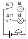 一个商品仓库,后门进货、前门取货,现有红、绿两只灯泡和一个电铃,一个电池组、两个开关,还有若干条导线,请你为仓库管理员设计一个电路:电铃响同时绿灯亮,表示送货人在后门按开关,电铃响同时红灯亮表示前门取货人在前门按开关.要求画出电路图,图中要标明红灯、绿灯及相应的前门、后门的开关.