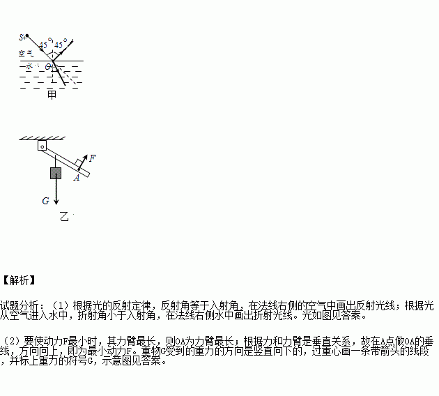 (2)如图乙所示,杠杆处于平衡状态,作出所挂重物重力的示意图和在杠杆上A点所加最小作用力F的示意图.