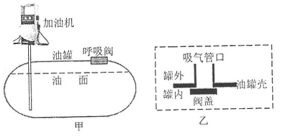 图甲为加油站加油系统示意图,油罐容积为30m3,为了降低油品损耗,保证油罐运行安全,在油罐顶部安装有调节油罐内外压力平衡的呼吸阀。其中吸气阀(图乙)管口面积为2×10-3m2,重力不计的吸气阀盖在0.6N的恒力作用下堵住吸气管口。加油时,加油机内油泵自动启动,加油枪流量控制为Q=5×10-4m3/s。(ρ油取0.8×103kg/m3外界大气压取105Pa,g=10N/kg)