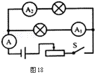 小刚和丽丽要探究并联电路电流规律,他们分别从实验室选取电流表3块,灯泡2只,开关1个,干电池,导线若干,并设计了实验电路图如图18所示: