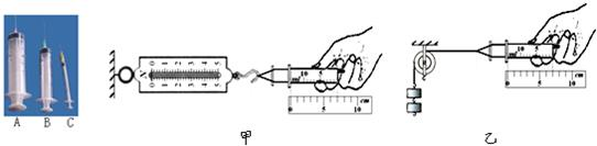 实验桌上有细线若干、两种规格的钩码(0.5N、2N)足够多、弹簧测力计一只(量程为5N、分度值为0.2N)、三种规格的注射器A、B、C(量程分别为20ml、10ml和5ml)、滑轮一只以及刻度尺一把.要求利用现有器材粗略测量大气压强.甲同学设计的方案如图甲所示,乙同学设计的方案如图乙所示.