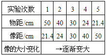 在“探究凸透镜成像规律”的实验中,小明按如图甲所示的装置进行实验,依次改变蜡烛的位置,移动光屏直到找到清晰的像。记录的数据如下表。