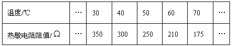 小明在研究性学习活动中,查阅到一种热敏电阻的阻值随温度变化的规律如下表,并将该型号的热敏电阻应用于如图所示由“控制电路”和“工作电路”组成的恒温箱电路中。