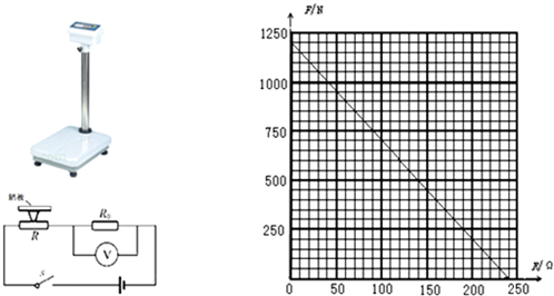 为定值电阻,R是电阻值随所受压力大小发生变化的可变电阻,更换电压表(量程为0﹣3V)的表盘后可直接显示人体质量大小.已知R的电阻与所受压力F变化的关系如图象所示.设踏板的质量忽略不计,电源电压保持9V不变.(g=10N/kg)