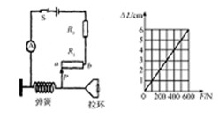 (2)已知该弹簧伸长的长度ΔL与所受拉力F间的关系如乙图所示。则当开关S闭合后,作用在拉环上水平向右的拉力为400N时,电流表的读数为多少A?
