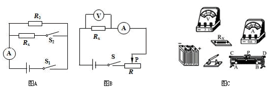 在学习欧姆定律之后,老师请同学们设计一个测未知电阻Rx的电路。(1)小明同学设计的电路如图A所示。R0为已知阻值的电阻,当S1闭合、S2断开时,电流表读数为I;当S1、S2都闭合时,电流表读数为I1。请你写出小明同学测Rx的表达式Rx= 。(2)小红设计了一种不同于小明同学设计的测量电路,如图B所示。请你将图C中的器材按图B电路连接起来(用笔连线表示导线),要求滑动变阻器的滑片P处于最右端时,连入电路的阻值最大。(3)小红设计的电路中,电源电压为12V,调节滑动变阻器的滑片P,使电流表的示数为0.2A时,电压表的示数恰为8V,求①Rx的电阻值 ②变阻器连入电路的电阻 ③滑动变阻器消耗的电功率。