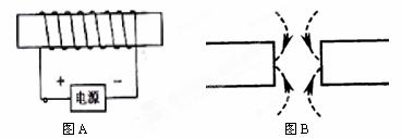 请在图A中标出通电螺线管的N、S极,在图B中标出磁体的磁极名称。