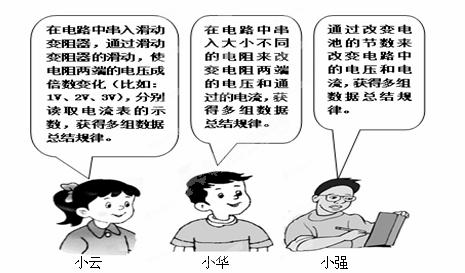 在探究“电流与哪些因素有关”的实验中,(1)为了探究电流与电压的关系,小明设计了如图所示的电路,评估方案时发现:该电路只能得出一组电流、电压数据,不能总结出电流随电压变化的规律。为了解决问题,同组的小云、小华和小强分别提出了自己的改进意见。