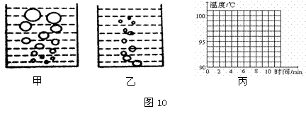在观察水的沸腾实验时,张怡然同学观察到沸腾前和沸腾时水中气泡上升过程中的两种情况如图10__甲、乙所示,则 图是沸腾前的情景, 图是沸腾时的情景.当水温升到90℃时,他记录了在加热过程中温度随加热时间的变化情况,数据如下表: