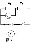 如图所示电路,开关S闭合后,电压表V1的示数为2V,电压表V的示数为6V,则电阻R2两端的电压为 ________ V。