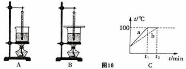 (2)乙、丙两组同学虽然选用的实验装置相同,但水开始沸腾的时刻不同,他们观察到水沸腾时将有大量的气泡产生,如右 图(填“a”或“b”)所示。同时他们绘制的沸腾图像如图C所示,得到a、b两种不同图像的原因是水的 不同。