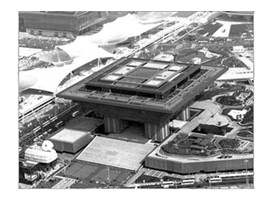 如图为上海航拍照片——世博会中国馆,在航空摄影时,照相机的胶片上所成的像是( )