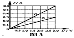 在某一温度下,连接在电路中的两段导体A和B中的电流与其两端电压的关系如图3所示,由图中信息可知( )