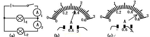 如图所示(a),当开关S闭合时,两只电流表的示数分别由图(b)、(c)读得,则电灯L1中的电流是( )