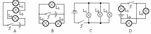 图6所示的四个电路中,闭合开关S,三盏灯属于并联的是