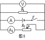 图8所示的电路中,电源电压保持不变。闭合电键S,当滑动变阻器的滑片P向右移动时,电压表V的示数将 (19) ,电流表A与A1示数的差值将 (20) (均选填“变大”、“不变”或“变小”)。