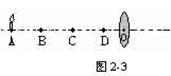 如图2-3所示,蜡烛从距凸透镜外的A点出发,沿主光轴经B、C到达D点,当它移动到B 点时,所成的像正好与烛焰等大,已知AB=BC=CD=10厘米,蜡烛经过C点时烛焰成 像,到达D点时烛焰成 像