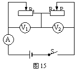 小华同学用图15所示的电路,研究通过导体的电流与导体两端的电压、导体电阻间的关系。若保持电源电压的大小和变阻器R1的阻值不变,移动滑动变阻器R2的滑片P,可测得不同的电流、电压值,如表1所示.然后,他又改变变阻器R1的阻值,测得相应的电流值,如表2所示.